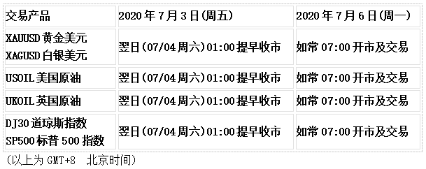因应美国市场美国独立日假期,以下产品的交易时间将于07/04周六01:00提早收市,敬请阁下留意知悉!